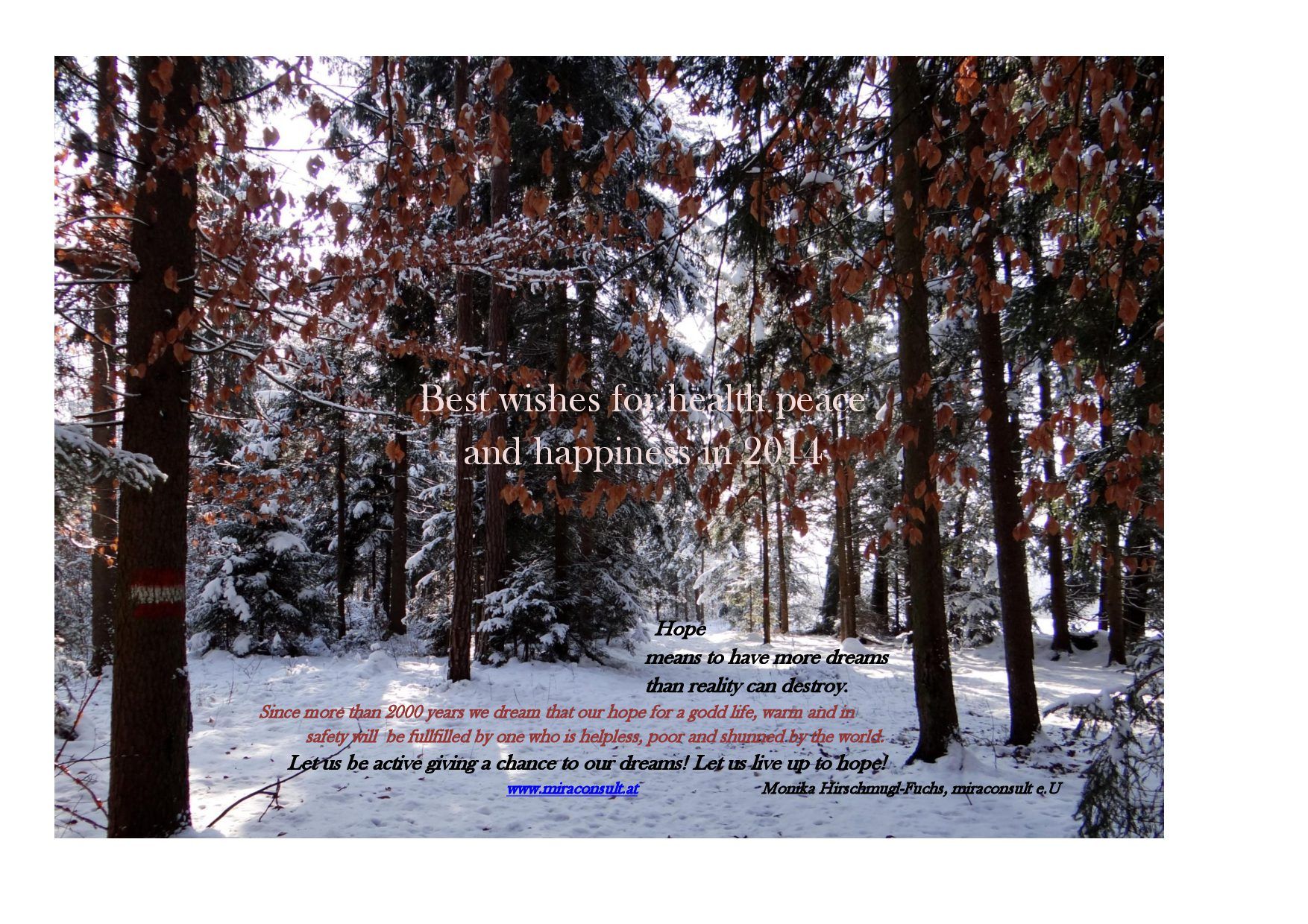 Auf diesem Weg möchten wir Geschenke weiter teilen, Geschenke, die ich erhalten habe, die mir Freude bereiten und, die sich vermehren, je öfter sie geteilt werden. Sie stehen schon seit Weihnachten auf der Webseite von miraconsult e.U. zur Abholung bereit. Den wunderschönen Winterwald hat Anni Aldrian mir geschenkt, den Anstoß für die Weihnachtsgedanken habe ich von Christian Bischoff erhalten und das Buch (ja, ein ganzes Buch), „Was allen gehört“, hat die Armutskonferenz verschenkt und lädt zum Weiterschenken ein. Viel Freude damit.“
